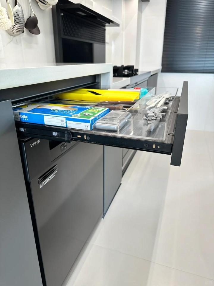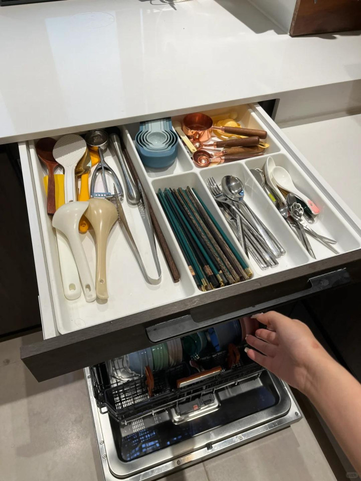 洗碗机依然走进千门万户,洗碗机高度固定,橱柜台面高度不固定,这手艺台面和洗碗机之间就会有3-8厘米的间隙,好多东说念主嫌这个间隙小,合计不消,但只消将这里作念成抽屉,就能非凡用来收纳多样厨房餐具了,相当好用,相当通俗。