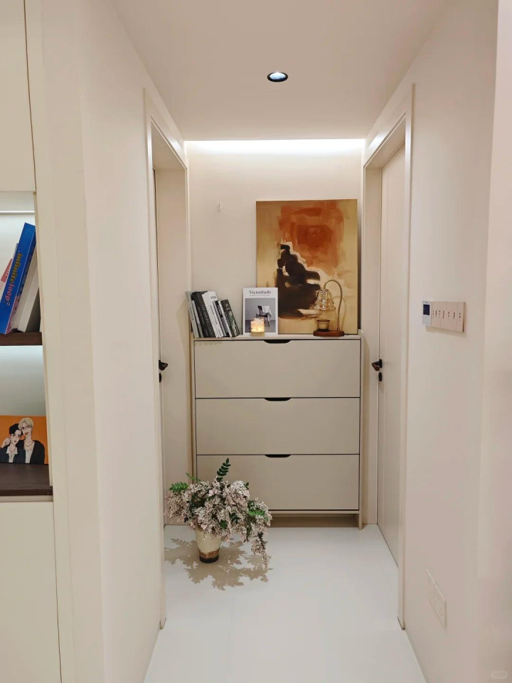 上图这个走说念止境唯有十几厘米,但完全可以放下一个20多厘米的矮柜,上头慵懒的斜靠一幅画,果然颜面又实用啊!