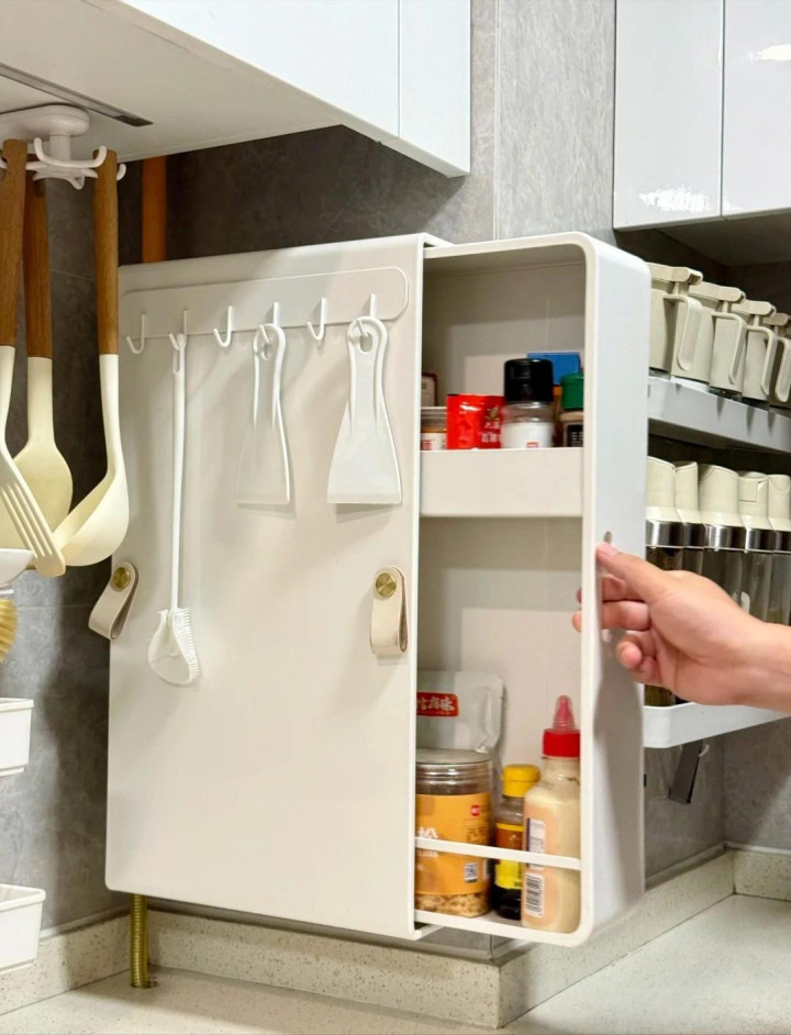 另外这个厨房池塘侧边的柜子隔板上,多样挂件一安设,好多小东西的收纳这不就有位置了?