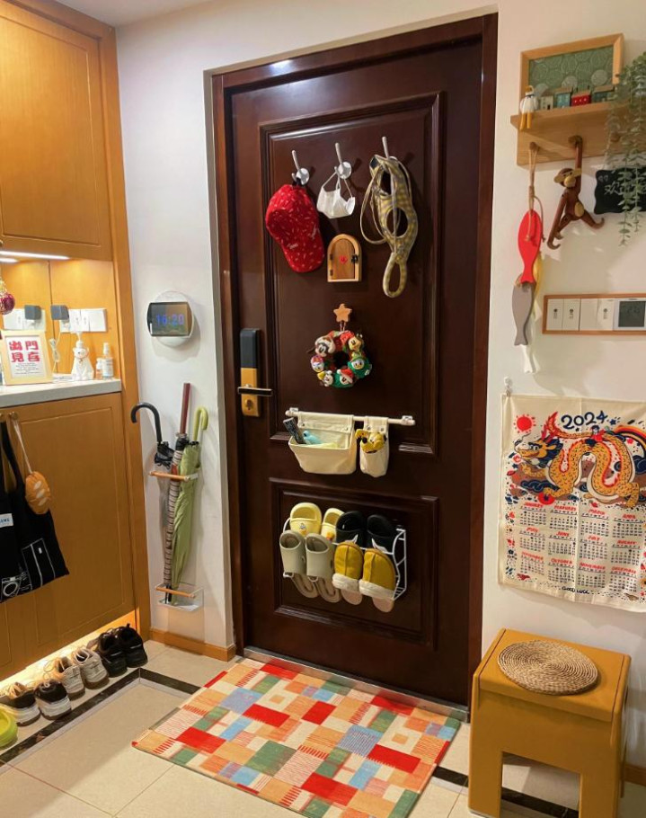 入户门后面两个支架,三个挂钩就能收纳几双拖鞋,就能挂帽子和领巾,同期傍边的雨伞收纳和强电箱底下的挂钩和换鞋凳亦然相当实用。
