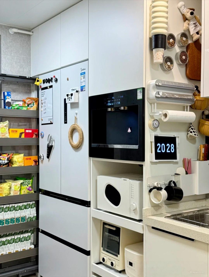 比如上图这个雪柜和橱柜之间的疏漏,大部分东说念主皆合计其不消,最多也即是在这里放垃圾桶或者堆小数干货。