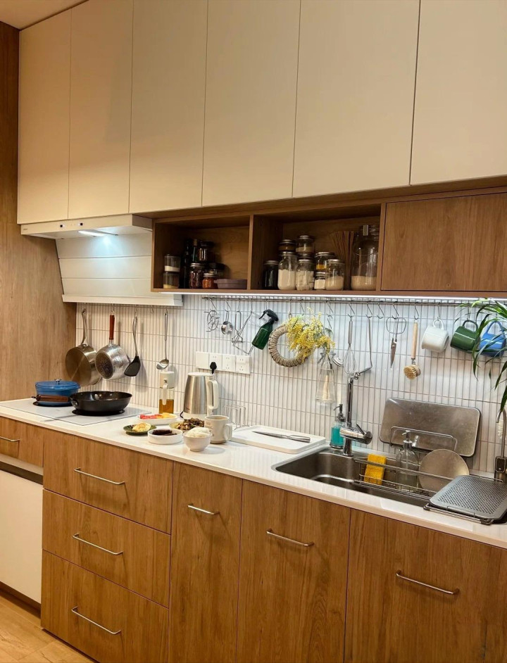 比如上图吊柜底下的二层小吊柜,能收纳厨房里面不少的瓶瓶罐罐,底下的挂钩更是能挂不少厨房器具和多样口杯,果然用着顺遂,看着活命气味满满。