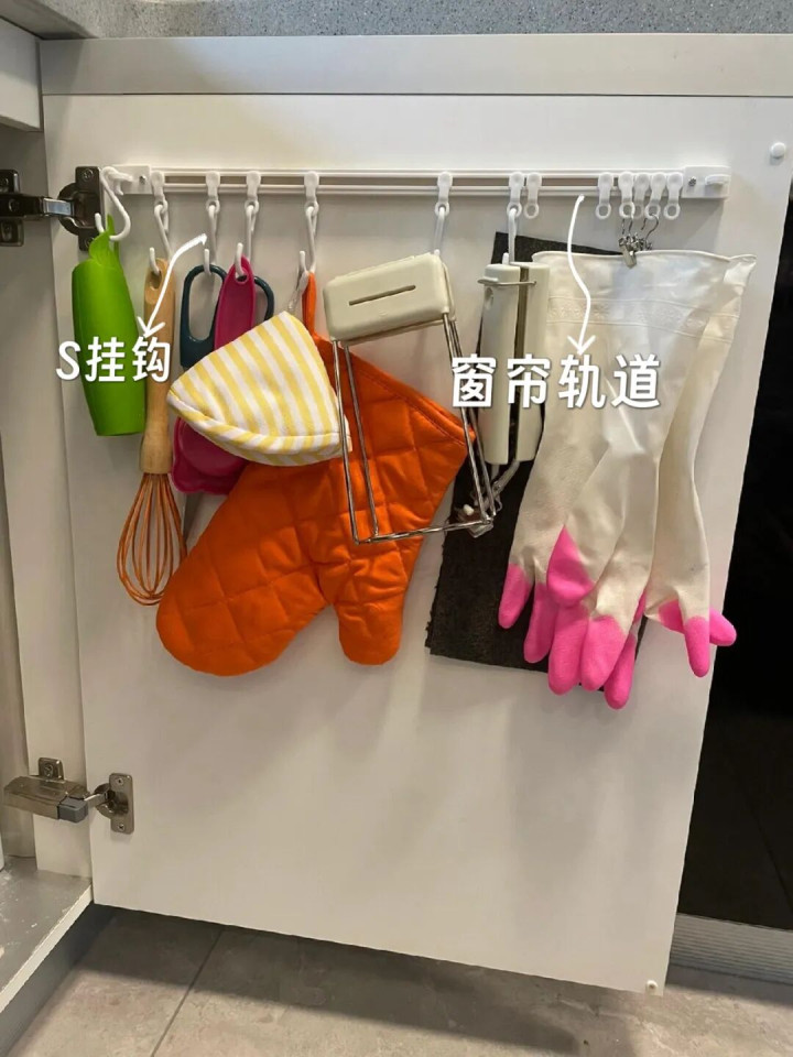 橱柜门后面一根窗帘轨说念,几个S型挂钩,十几样小东西不就有方位挂了?