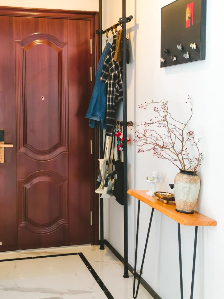 上图这个入户门边也很小,也即是一面墙,但并莫得毁灭不消,大概的挂衣钩加上穿衣镜之后,这里就成为家里秋冬天最实用的方位,就成为女主东说念主最可爱的方位。
