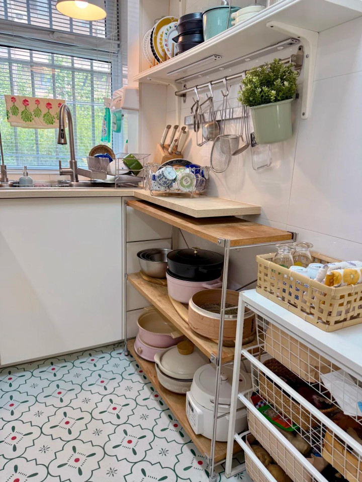 上头这个厨房并不大,和好多家庭的厨房大小差未几,但它并莫得亏损厨房走说念空间,而是用多样可迁移支架和墙上的隔板让这个厨房更能装,比如多样锅具放在离池塘近的架子上,比如生果蔬菜放在离厨房门近的架子上。